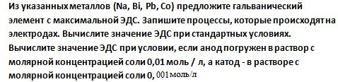 Смотри во вложении. Каким сайтом пользовалась в определении гальванического элемента с максимальной ЭДС, напишу в сообщении. Должно быть хотя бы приблизительно верно.