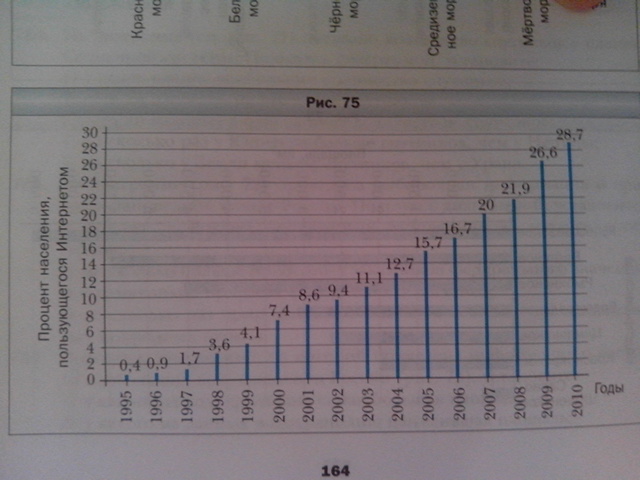 На рисунке приведена диаграмма количества пользователей Интернета в мире в процентах по отношению к общему количеству населения с 1995 по 2010 год. В течении какого года произошёл наименьший прирост количества пользователей? Наибольший прирост?