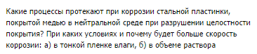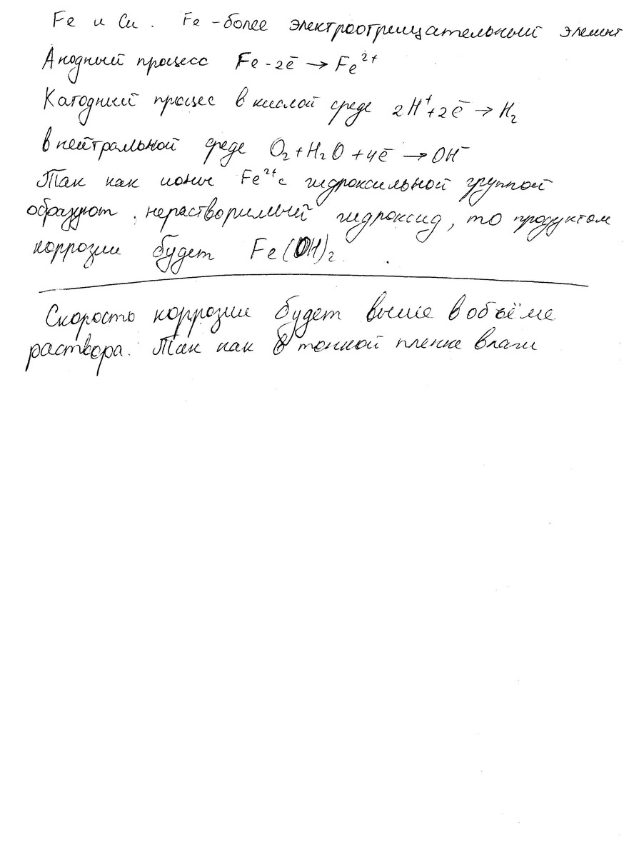 Насчет второго вопроса. Не могу сказать точно, но скорость коррозии возможно будет больше при тонкой пленке раствора. Так как в нейтральном растворе сначала должно окисляться железо, а потом медь. Но так как железо покрыто медью происходит задержка коррозии. При тонкой пленке, коррозия целенаправленно идет через царапину на поверхности, где нет меди, поэтому полный процесс коррозии протекает быстрее.
