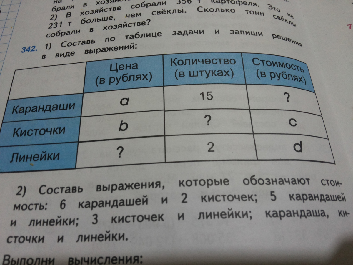 Там ниче сложного)) в таблице где карандаши в ячейке пишем (15*а); где кисточки в ячейке пишем (с:в); где линейка (d:2). Узнали неизвестные даные. Теперь Б) 1) 6*а+2*b; 2) 5*а+d; 3)3b+d; 4)a+b+d:2; все)