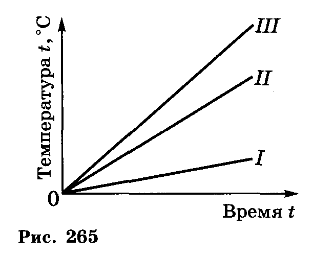 На одинаковых горелках нагревались вода, медь и железо равной массы. Укажите, какой график (рис. 265) построен для воды, какой — для меди и какой — для железа.