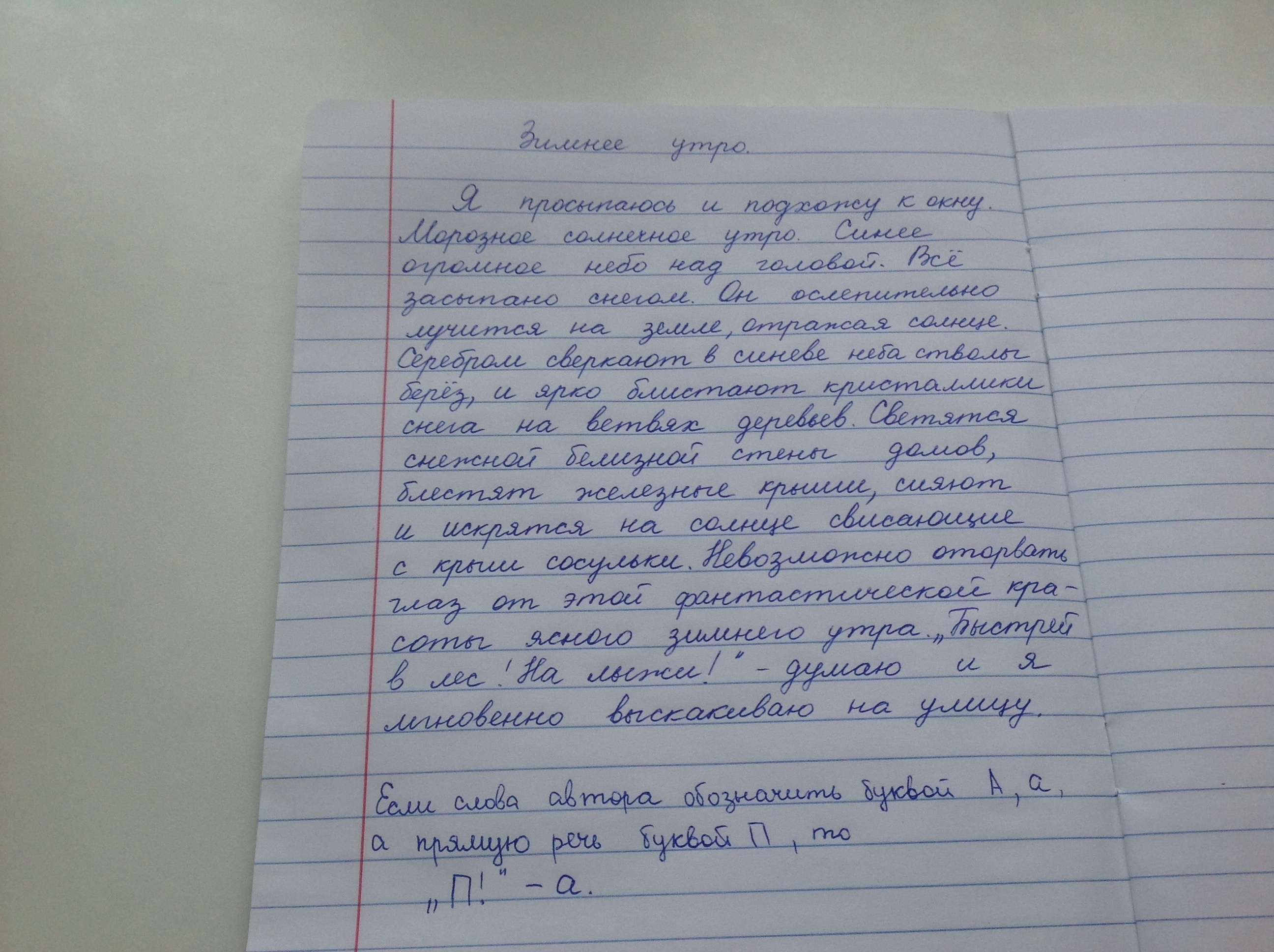 Я просыпаюсь и подхожу к окну. Морозн__ солнечн__ утро. Син__ огромн__ небо над головой.Всё засыпано снегом.Он ослепительно блестит на земле,отражая солнце.Серебром блестят в с_неве неба стволы берёз, и ярко блестят кристаллики снега на ветвях деревьев. Блестят снежн__ белизной стены домов,блестят железные крыш,блестят искрятся на солнце свисающие с крыш сосульки.Невозможно оторвать глаз от этой фантастичекой красоты ясного зимнего утра. "Быстрей в лес! На лыжи! " -думаю и я мгновенно выскакиваю на улицу.
