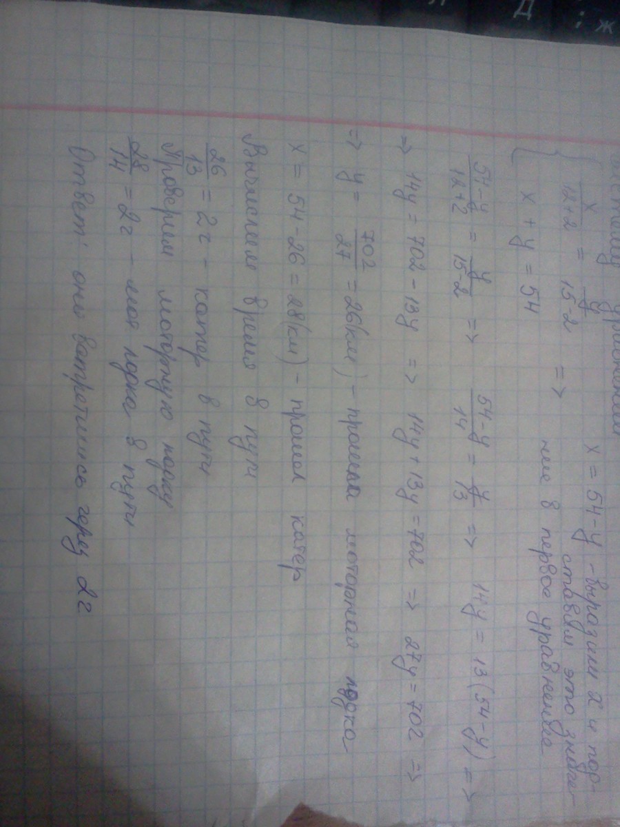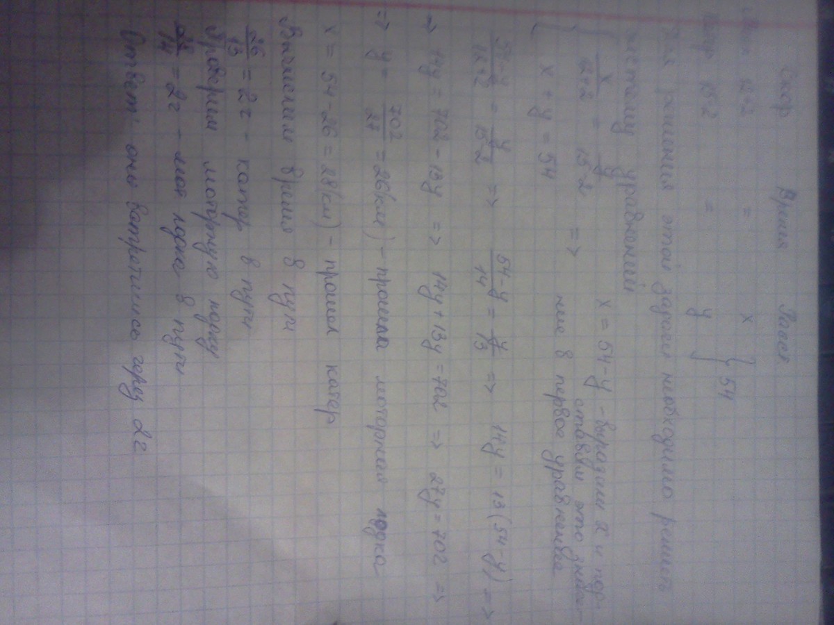 По реке вниз по течению плывет моторная лодка, а навстречу ей катер. Через какое время после начала движения лодка и катер встретятся, если их собственные скорости равны 12 км/ч и 15 км/ч соответственно, скорость течения реки 2 км/ч; лодка и катер начали движение одновременно, находясь на расстоянии 54 км друг от друга?