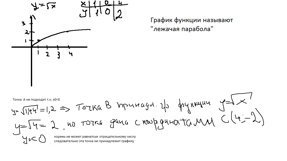 Постройте график функции y=√x. Какие из точек А(-36;6) В(1,44;1,2) С(4;-2) принадлежит графику функции? ( напишите поподробнее)