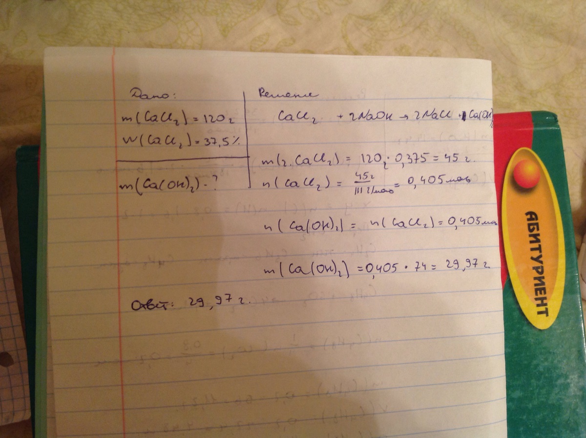 обчисліть масу осаду одержаного в результаті взаємодії CaCl2 масою 120 г з масовою часткою солі 37,5% і надлишку розчигу NaOH