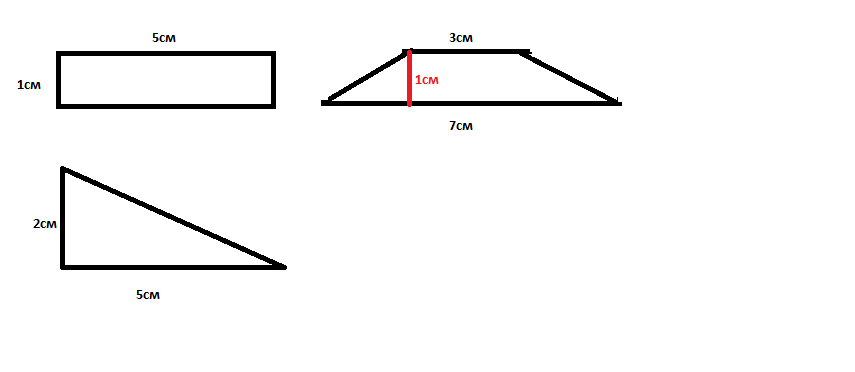 3)трапеция высота 1, верхнее основание 3, нижнее 7см