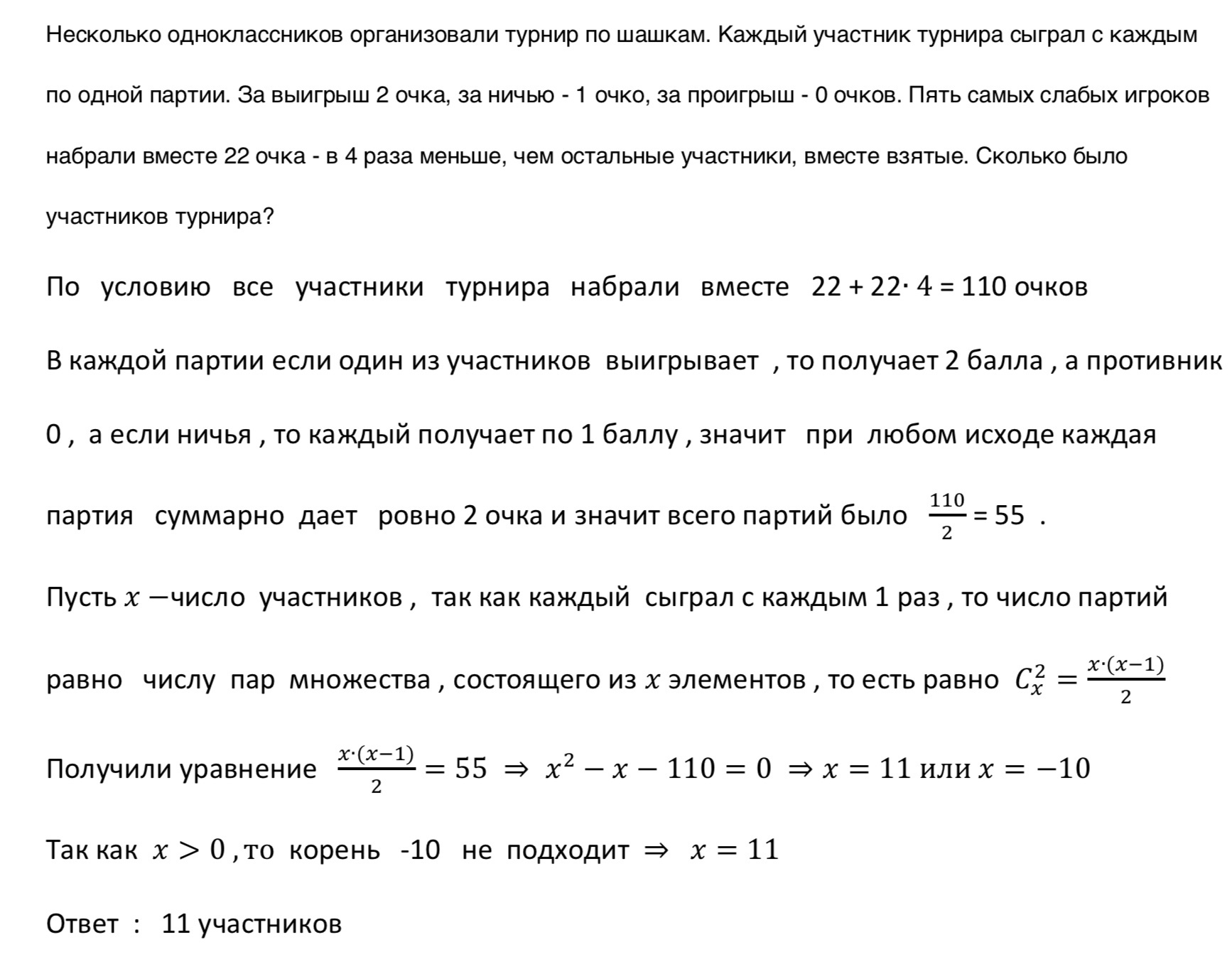 несколько одноклассников организовали турнир по шашкам. Каждый участник турнира сыграл с каждым по одной партии. За выигрыш 2 очка, за ничью- 1 очко, за проигрыш - 0 очков. Пять самых слабых игроков набрали вместе 22 очка - в 4 раза меньше, чем остальные участники, вместе взятые. Сколько было участников турнира?