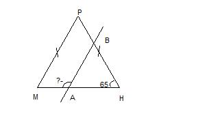 Найдите угол МАВ, если треугольник МРН-р/б с основанием МН, прямая АВ параллельна стороне МР, а угол Н=65 градусов