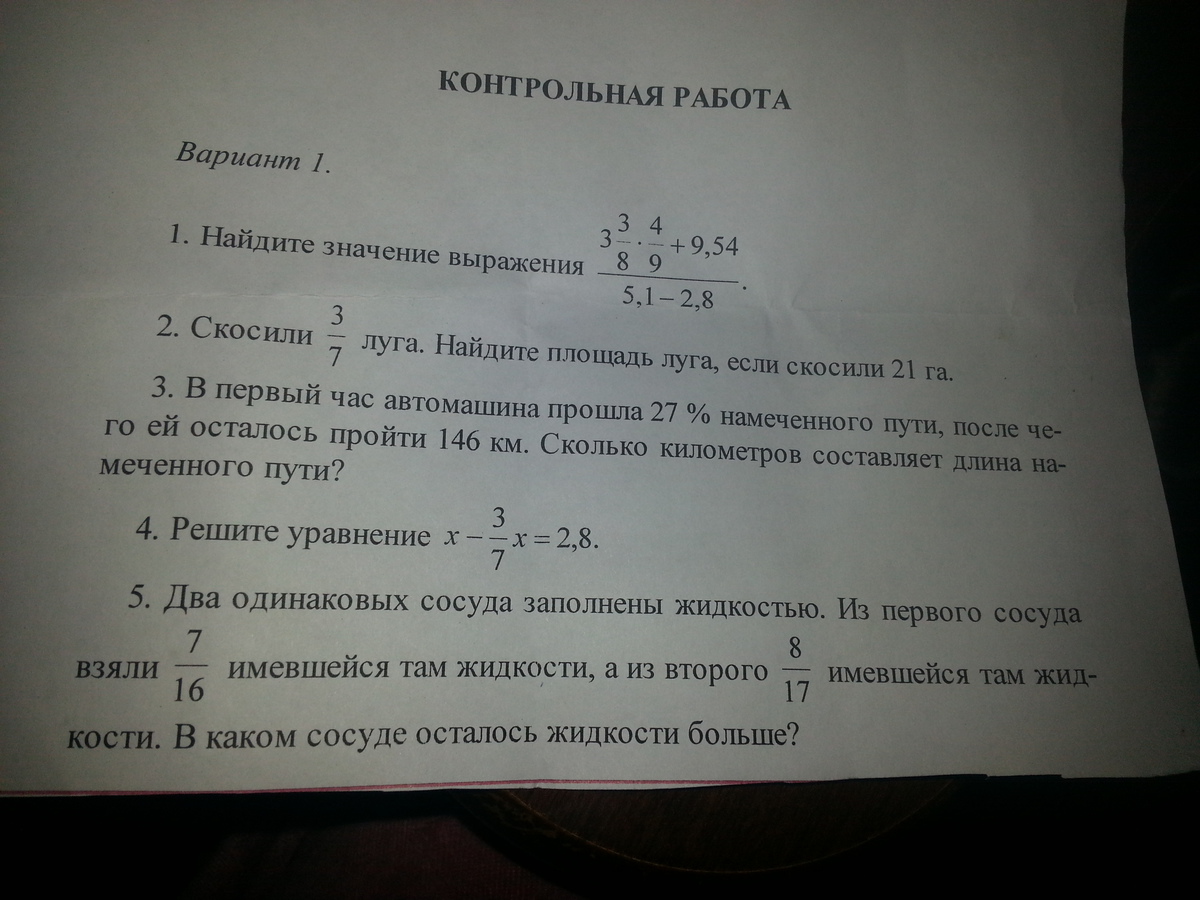 Задача 3. 1)100%-27%=73%; это остались 146км. 2)146км:73=2км это 1%; 3) 2км*27%=54км это те км что прошла в первый час. 4) 54км+146км=200км это вся длина. Попробую остальное решить счас 5задача. Осталось больше в том где 7/16 брали.