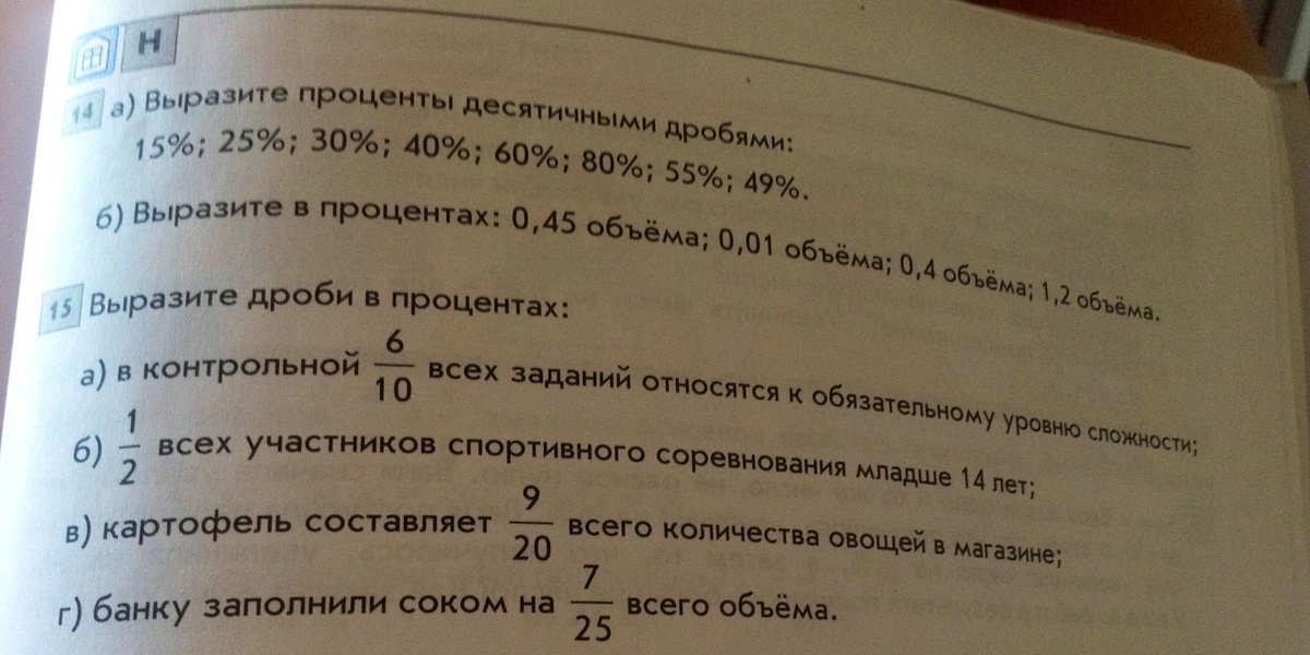 1) Выразить проценты десятичными дробями 15%,25%,30%,40%,60%,80%,55%,49%..........2)Выразите в процентах 0,45обьёма,0,01 обьёма,0,4 Обьёма,1,2 объёма.