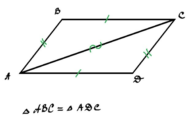 1) Диагональ параллелограмма делит его на два равных треугольника.