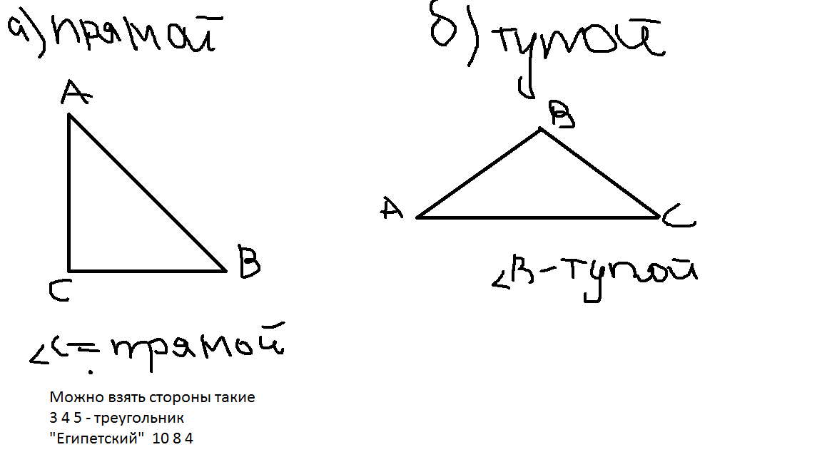 Начертите треугольник один из углов которого:А)примой Б)тупой Измерьте и запишите длины сторон треугольника.