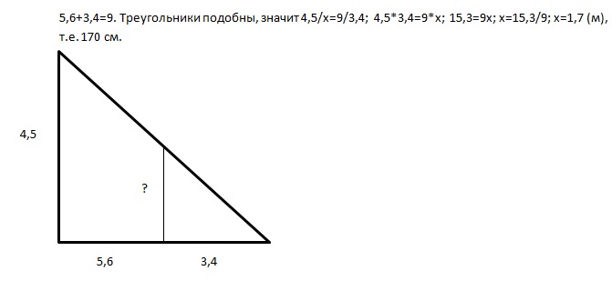Высота фонарного столба 4.5 метром,человек стоит в 5.60 метров от столба,отбрасывая тень 3,4 метра. Каков рост человека?