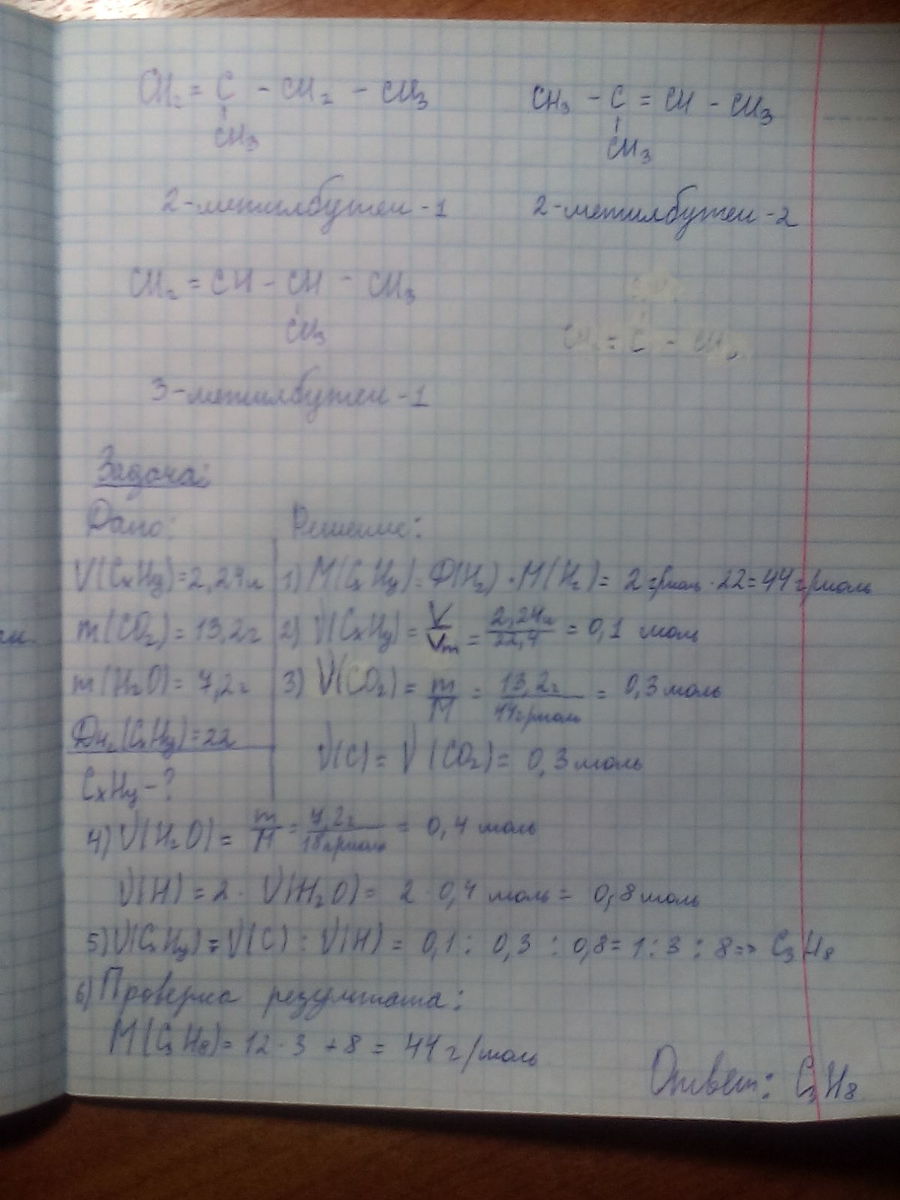 2. При сжигании углеводорода объемом 2.24л получили 13.2г оксид углерода(4) и 7.2г воды.Относительная плотность углеводорода по водороду равна 22.Найдите молекулярную формулу углеводорода.