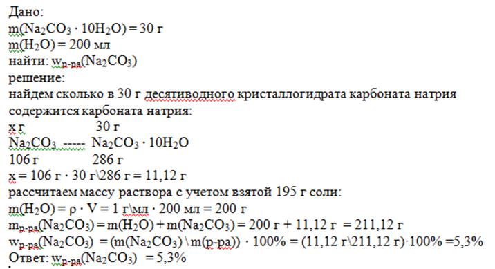 В 200 мл воды растворили 30 г десятиводного кристаллогидрата карбоната натрия (Na2CO3×10H2O). Рассчитайте массовую долю карбоната натрия в растворе.