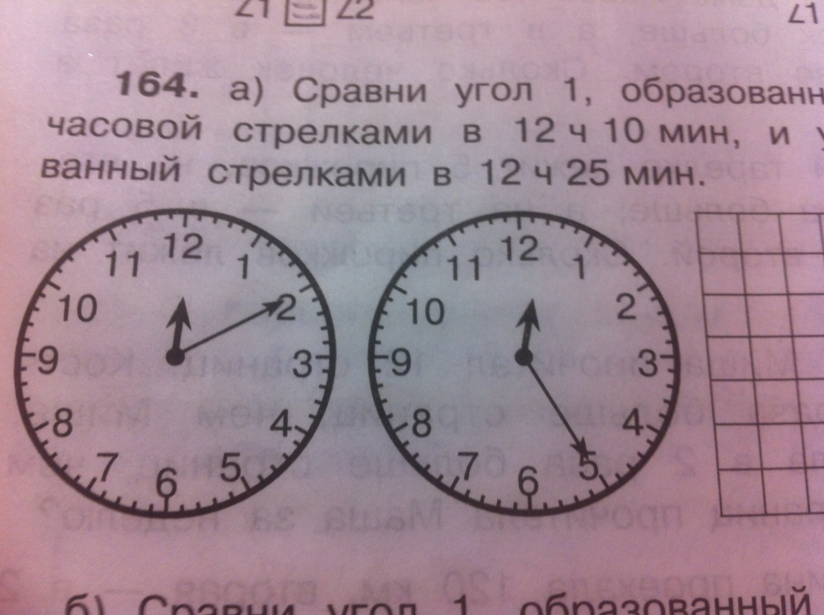 а) сравни угол 1 образованный минутной и часовой стрелками в 12 ч 10 мин. и угол 2 образованный стрелками в 12 ч 25 мин