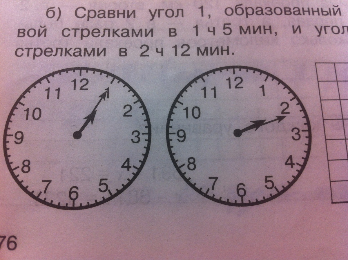 б) сравни угол 1.образованный минутной и часовой стрелками в 1 ч 5 мин. и угол 2. образованный стрелками в 2 ч 12 мин