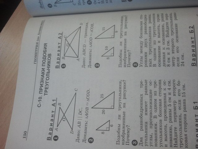 если 2 угла одного треугольника соответственно равны двум уголам другого треугольника, то такие треугольники равны, т. к. угол А равен углу С, а углы ВОА И DОС равны как веритикальные углы, то треугольники АОВ и COD подобны( по 1 признаку)