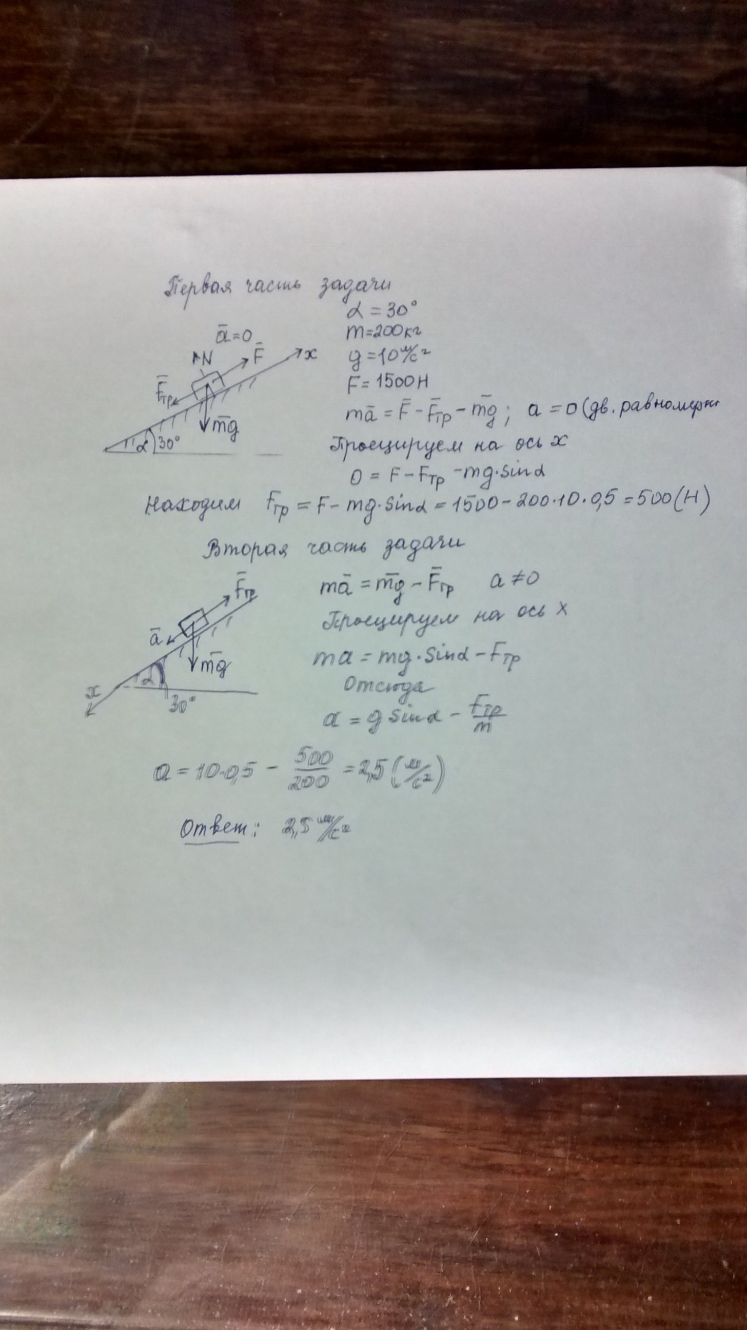 Тело массой 200 кг равномерно поднимают по наклонной плоскости, образующей угол 30° с горизонтом, прикладывая силу 1500 Н вдоль линии движения. С каким ускорением тело будет соскальзывать.
