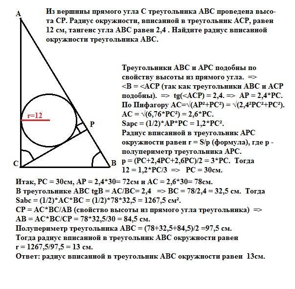 Из вершины прямого угла C треугольника ABC проведена высота CP. Радиус окружности, вписанной в треугольник ACP, равен 12 см, тангенс угла ABC равен 2,4 . Найдите радиус вписанной окружности треугольника ABC