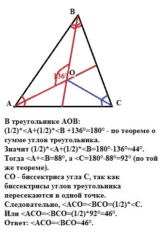 Биссектрисса АА1 и ВВ1 треугольника АВС пересекаются в точке О. Найдите углы АСО и ВСО,если АОВ=136