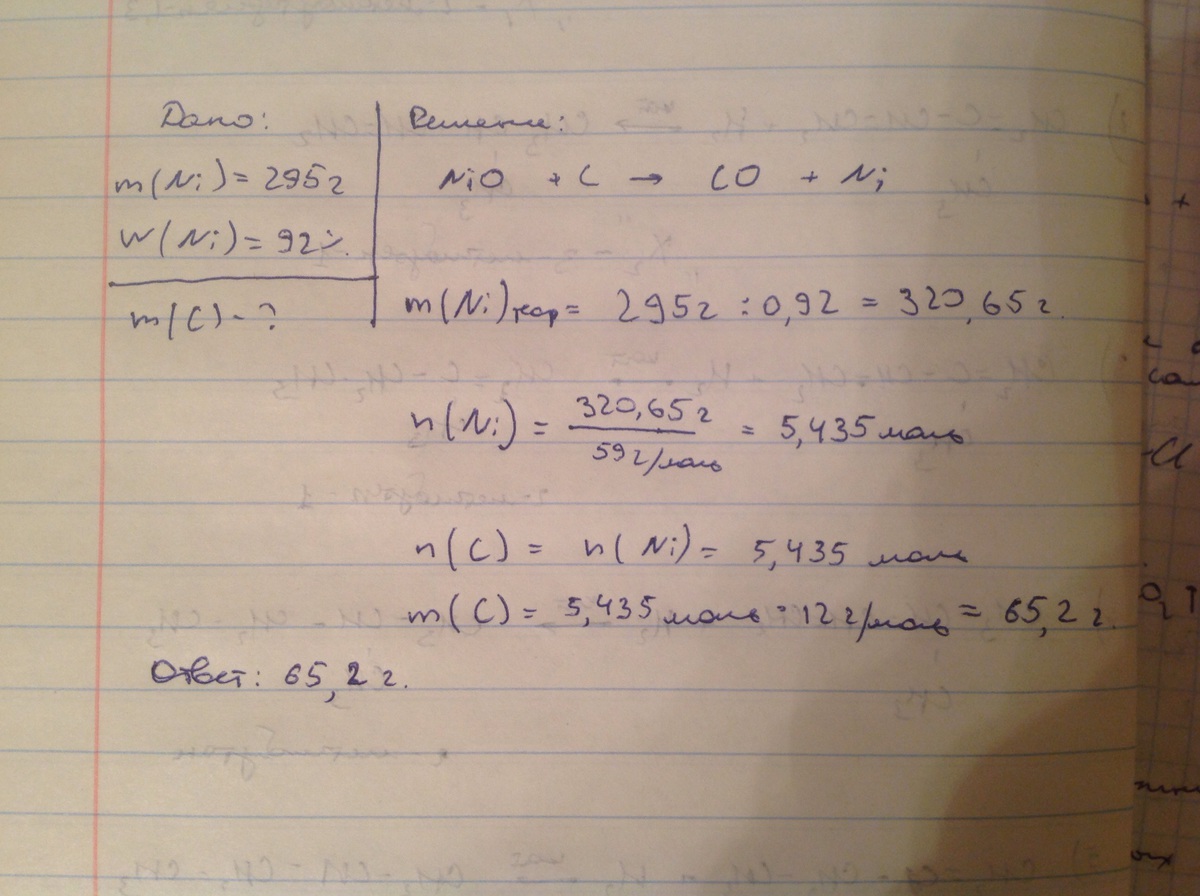 Для получения Никеля используют восстановление оксида никеля (II) углеродом. Какую массу угля надо взять для получения никеля массой 295 г,