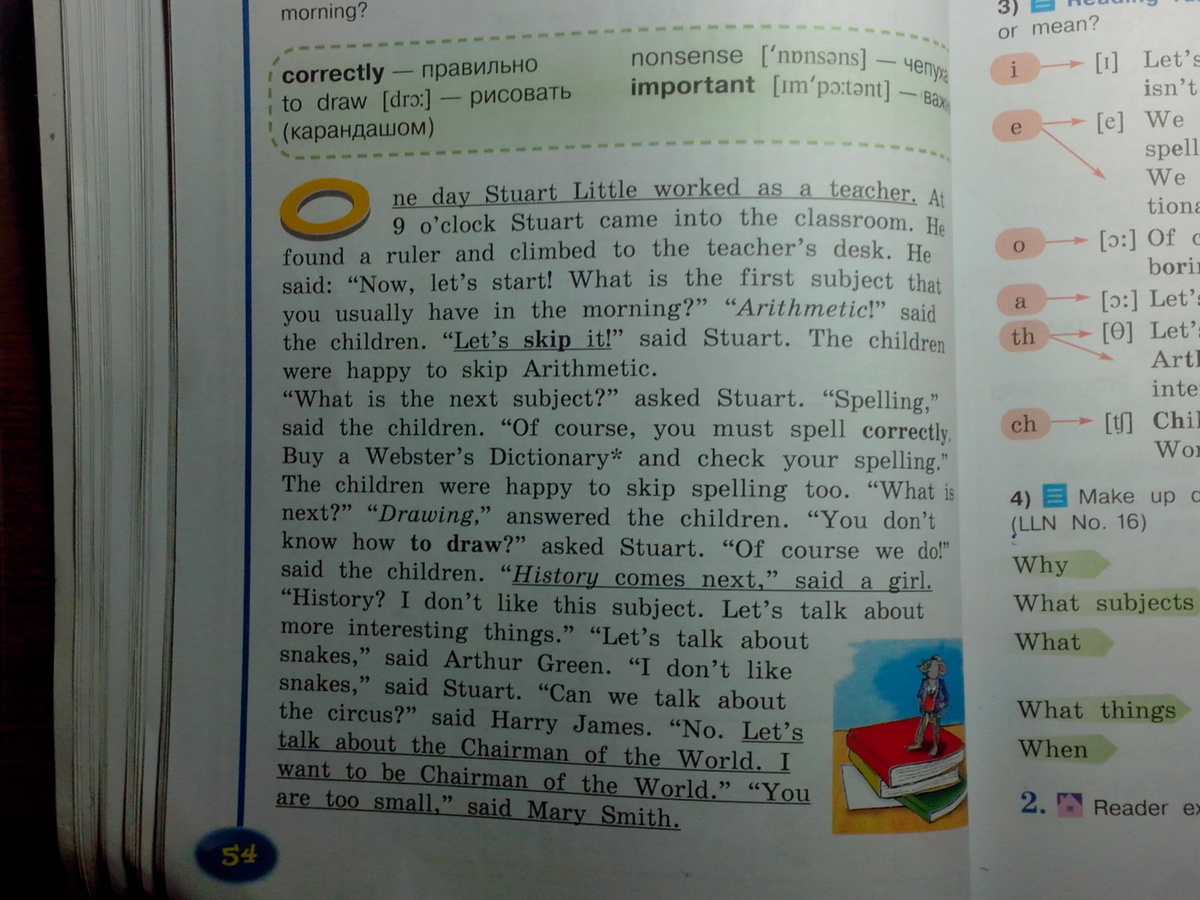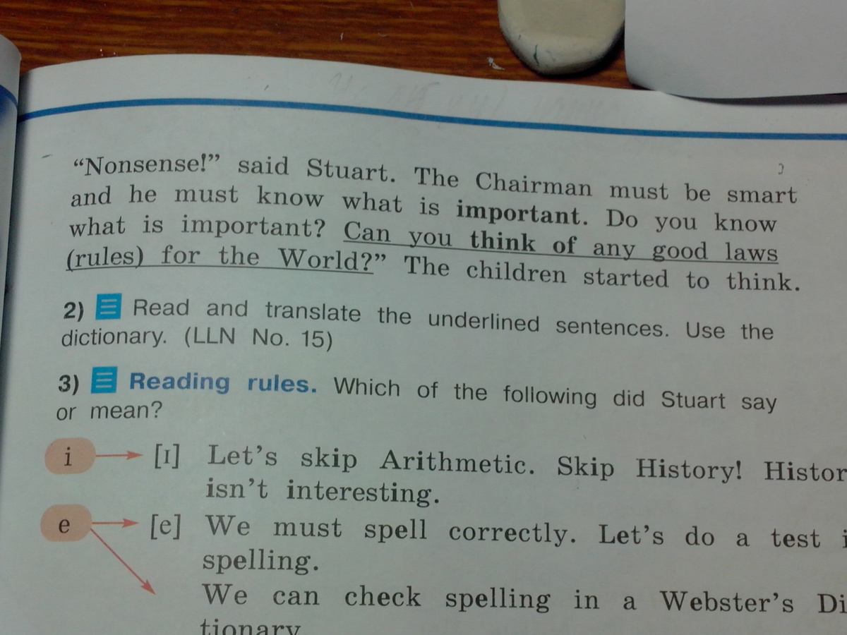 "Какой следующий урок?", спросил Стюард. "Произношение", ответили дети. "Конечно, вы должны произносить правильно, купите словарь и проверьте свое произношение". Дети были счастливы пропустить еще один урок. "Что следующее?". "Рисование", ответили дети. "Вы не знаете как рисовать?", спросил Стюард. "Конечно, мы знаем!", ответили дети. "История идет следующей" - сказала девочка. "История? Я не люблю этот предмет. Поговорим о более интересных вещах". "Поговорим о змеях", предложил Артур Грин. "Я не люблю змей", ответил Стюард. "Мы можем поговорить о цирке", сказал Гарри Джеймс. "Нет, поговорим о мировом правителе. Я хочу им быть". "Ты такой маленький", сказала Мери Смит. "Нонсонс!", сказал Стюард. "Правитель должен быть умным и знать, что является важным. Вы знаете, что важно? Вы можете подумать о хороших законах (правилах) для мира?". Дети стали думать...