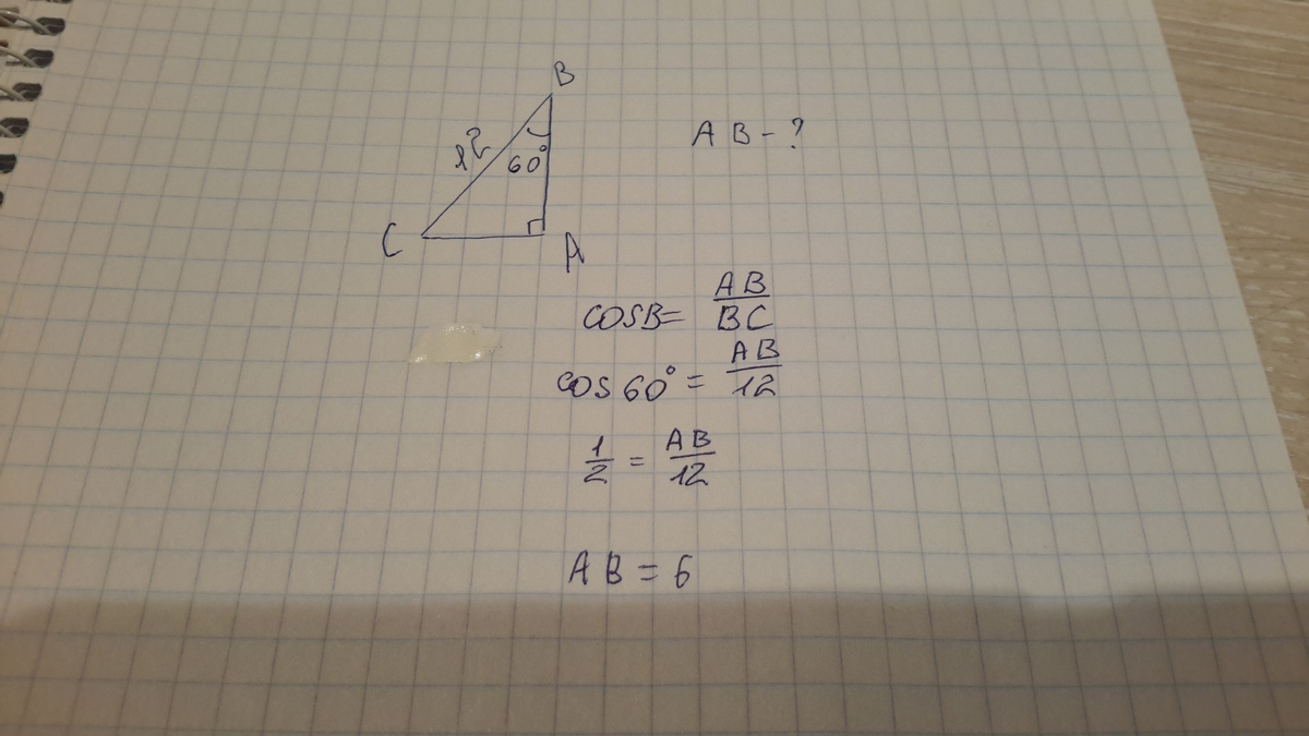решение задачи. В прямоугольном треугольнике ABC с прямым углом A , сторона BC равна 12 см,а угол B равен 60 градусов.Найти сторону AB