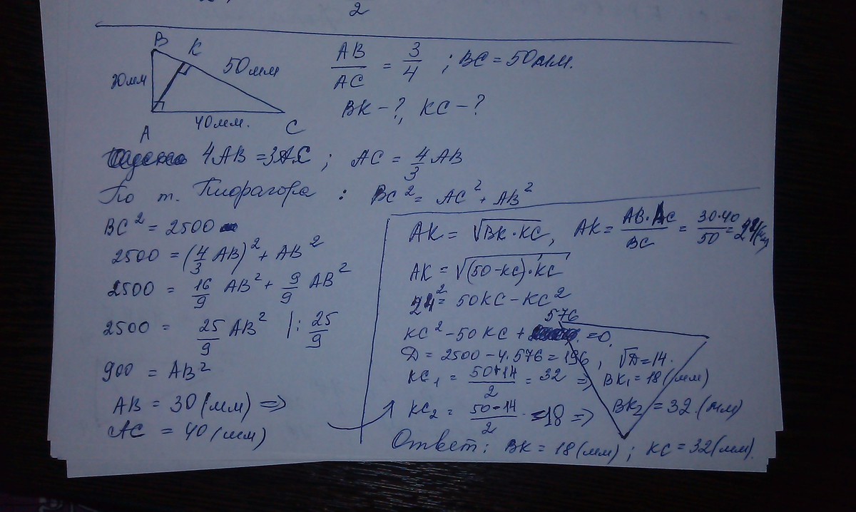В прямоугольном треугольнике катеты относятся как 3:4, а гипотенуза равна 50 мм. Высота, опущенная из вершины прямого угла, делит гипотенузу на два отрезка. Найдите это отрезки.