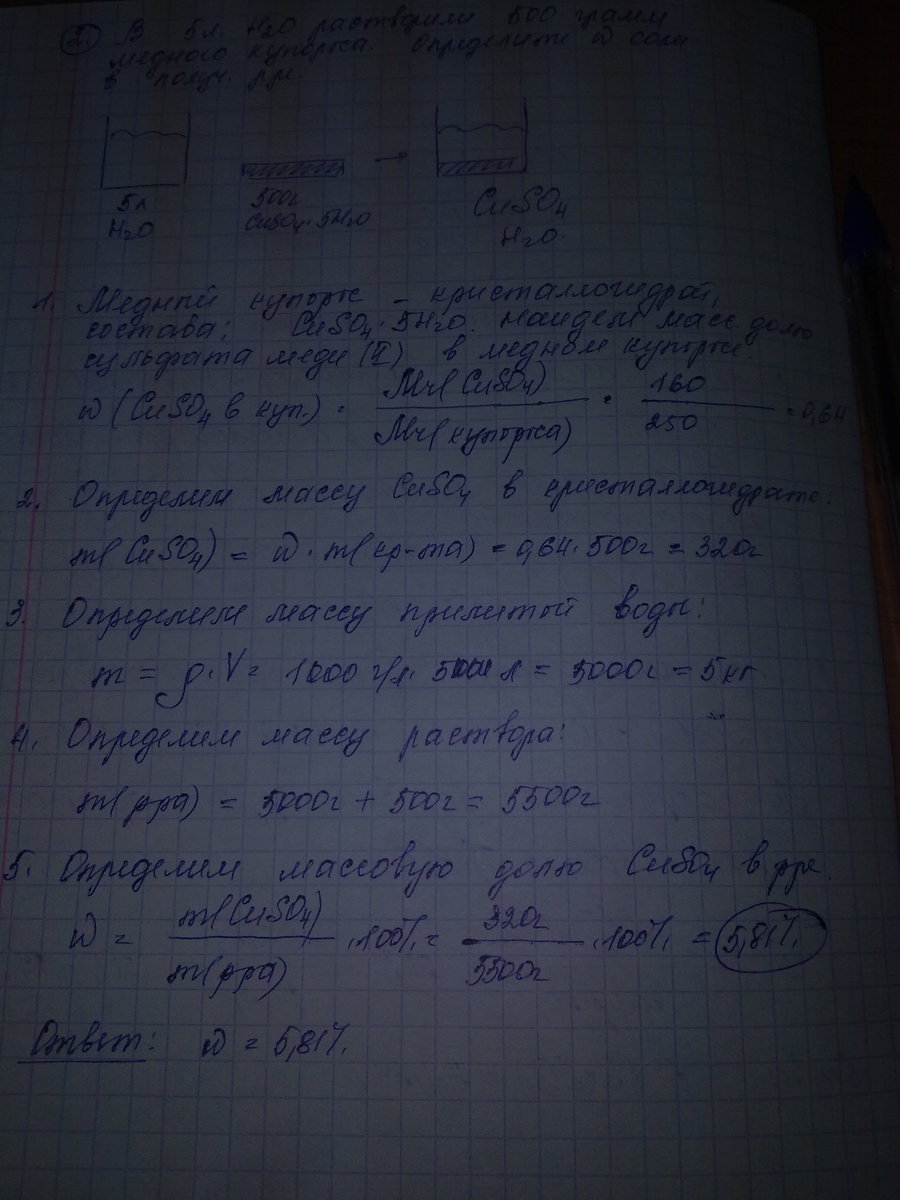 В 5 л воды растворили 500 г медного купороса. Вычислите массовую долю сульфата меди (ll) в полученном растворе.