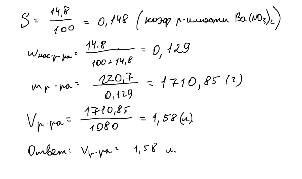 Коэффициент растворимости нитрата бария при 42*С равен 14,8г. Рассчитайте объём (л) насыщенного раствора (р= 1080г/л), содержащего 220,7г. соли. Рассчитайте молярную концентрацию.