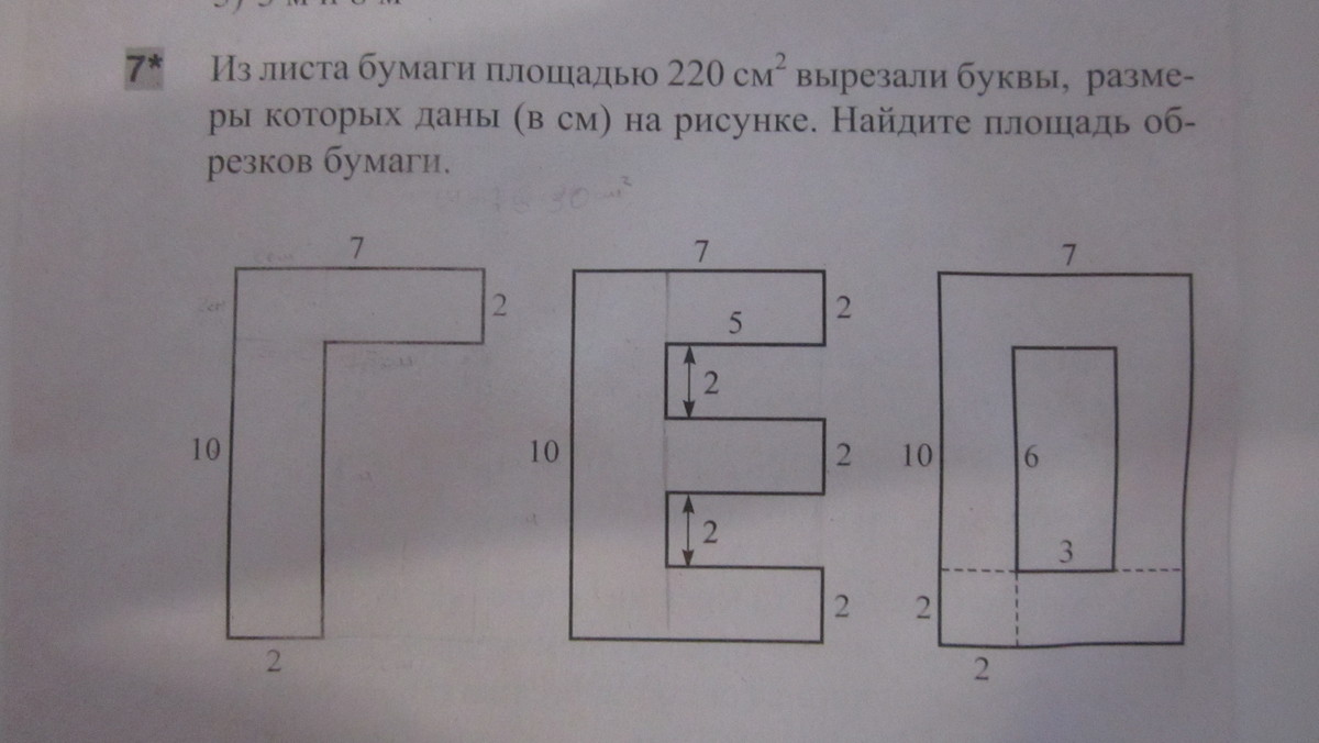 Общая площадь бумаги 220 см². Из нее вырезали буквы площадью 50 см², 52 см² и 30 см². Значит площадь обрезков составляет 220-30-50-52=88 см²