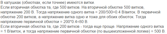 В катушках трансформатора имеется 200 и 500 обмоток. К вторичной катушке подключено 200 В. Каким будет напряжение в первичной обмотке? Чему равен