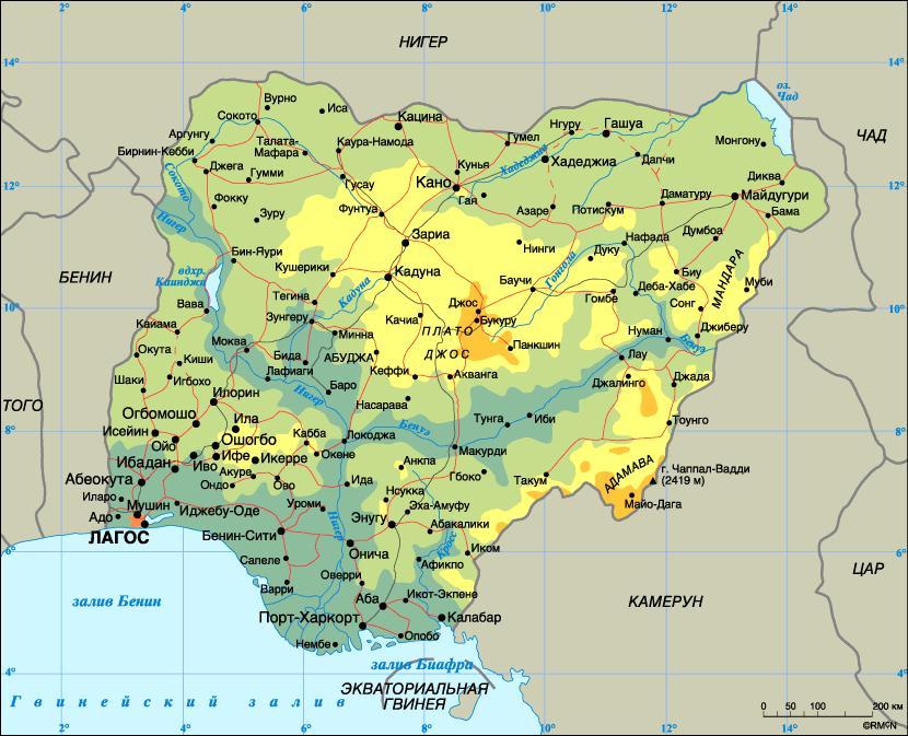 Если посмотреть на физическую карту Нигерии, которая дана ниже в приложении, то можно увидеть, что она разделена как-бы на две части:северную высокую, где преобладают плоскогорья и южную низкую, где расположены равнины и низменности.Самая высокая точка страны расположена на юго-востоке -это гора Чаппал-Вадди (2419 м).Страну пересекает много рек, самые крупные из которых это река Нигер и Бенуэ.В центральной части страны расположено высокое плоскогорье Джос ( до 1730 м), которое плавно переходит в равнину.