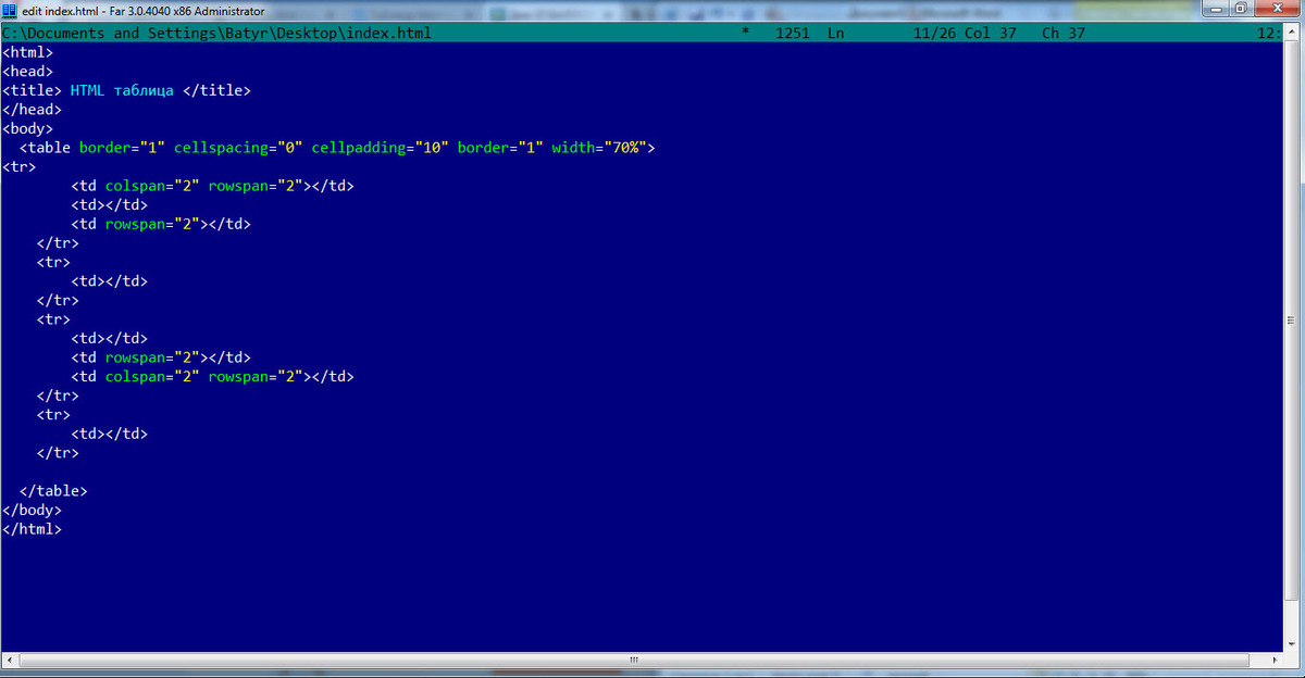<html><head><title> HTML таблица </title></head><body> <table border="1" cellspacing="0" cellpadding="10" border="1" width="70%"><tr> <td colspan="2" rowspan="2"></td> <td></td> <td rowspan="2"></td> </tr> <tr> <td></td> </tr> <tr> <td></td> <td rowspan="2"></td> <td colspan="2" rowspan="2"></td> </tr> <tr> <td></td> </tr>