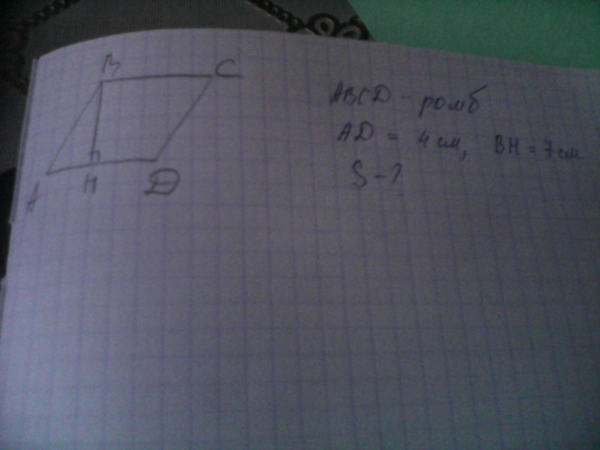 По условию ABCD - ромб. Основание AD=4, BH - высота. Площадь ромба равна произведению длины основания на высоту, проведенную к этому основанию. BH - высота, проведенная к основанию AD. Из этого следует, что мы можем воспользоваться этой формулой. S=AD*BH=7*4=28.