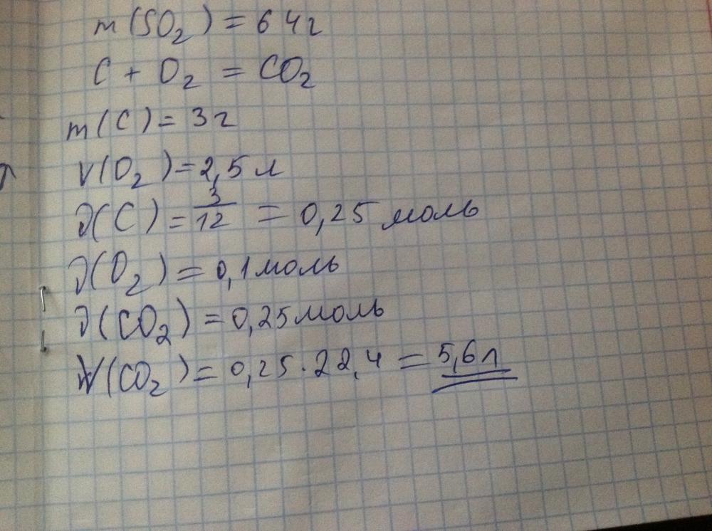 Вычислить объём углекислого газа, который образуется из 3 г углерода и 2.5 л кислорода.