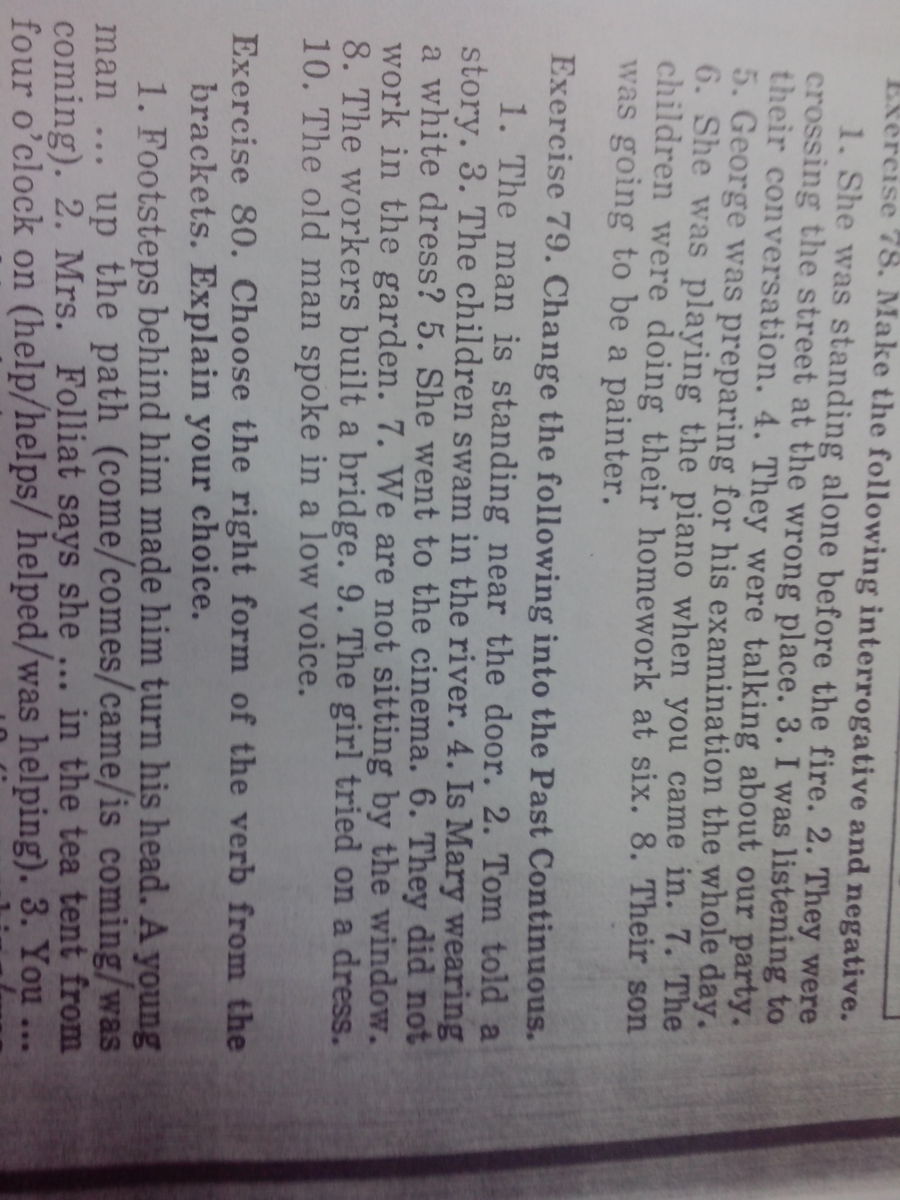 1. The man was standing near the door. 2. Tom was telling a story. 3. The children were swimming in the river. 4. Was Mary wearing a white dress? 5. She was going to the cinema. 6. They weren't working in the garden. 7. We were not sitting by the window. 8. The workers were building a bridge. 9. The girl was trying on a dress. 10. The old man was speaking in a low voice.