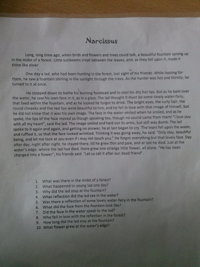 он нагнулся, чтобы смочить свой "пылающий" лоб и освежить свои сухие губы. но когда он наклонился к воде он увидел свое лицо в стекле как в зеркале. молодой человек подумал что это водная фея, которая жила в фонтане и как он увидел, он даже забыл про то, что он хотел пить. яркие глаза, кудрявые волосы, круглые щеки и красные губы были красивы ему, и он влюбился в свое отражение, и он не знал, что это отражение принадлежит ему. лицо в воде улыбалось, когда улыбался он, и когда говорил, в отражении губы двигались, но звука не было слышно. я люблю тебя всем сердцем - сказал парень. отражение улыбалось и протягивало руки, но отражение молчало. парень что то говорил ему, но оно молчало.он заплакал. слезы его пошатнули воду, так, что лицо, казалось, сморщилось. так, как парень думал, что оно уходит он сказал: только останься, прекрасное создание, и позволь мне смотреть на тебя, даже если я не смогу до тебя дотронуться. он забыл все, но только не это отражение.день за днем останавливался он у фонтана и глядел в воду уставившись на отражение. он становился худощавым и бледным, пока не умер. и только на берегу воды, где он умер пророс одинокий, странный цветок. он превратился в цветок! давайте назовем его в честь умершего товарища