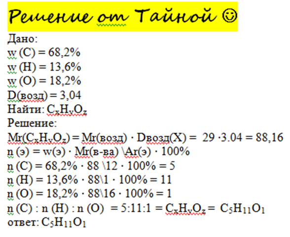 Органическое соединение, в котором массовая доля углерода равна 68,2%, кислорода-18,2%, водорода-13,6%, имеет относительную плотность паров по воздуху 3,04. Определите молекулярную формулу вещества