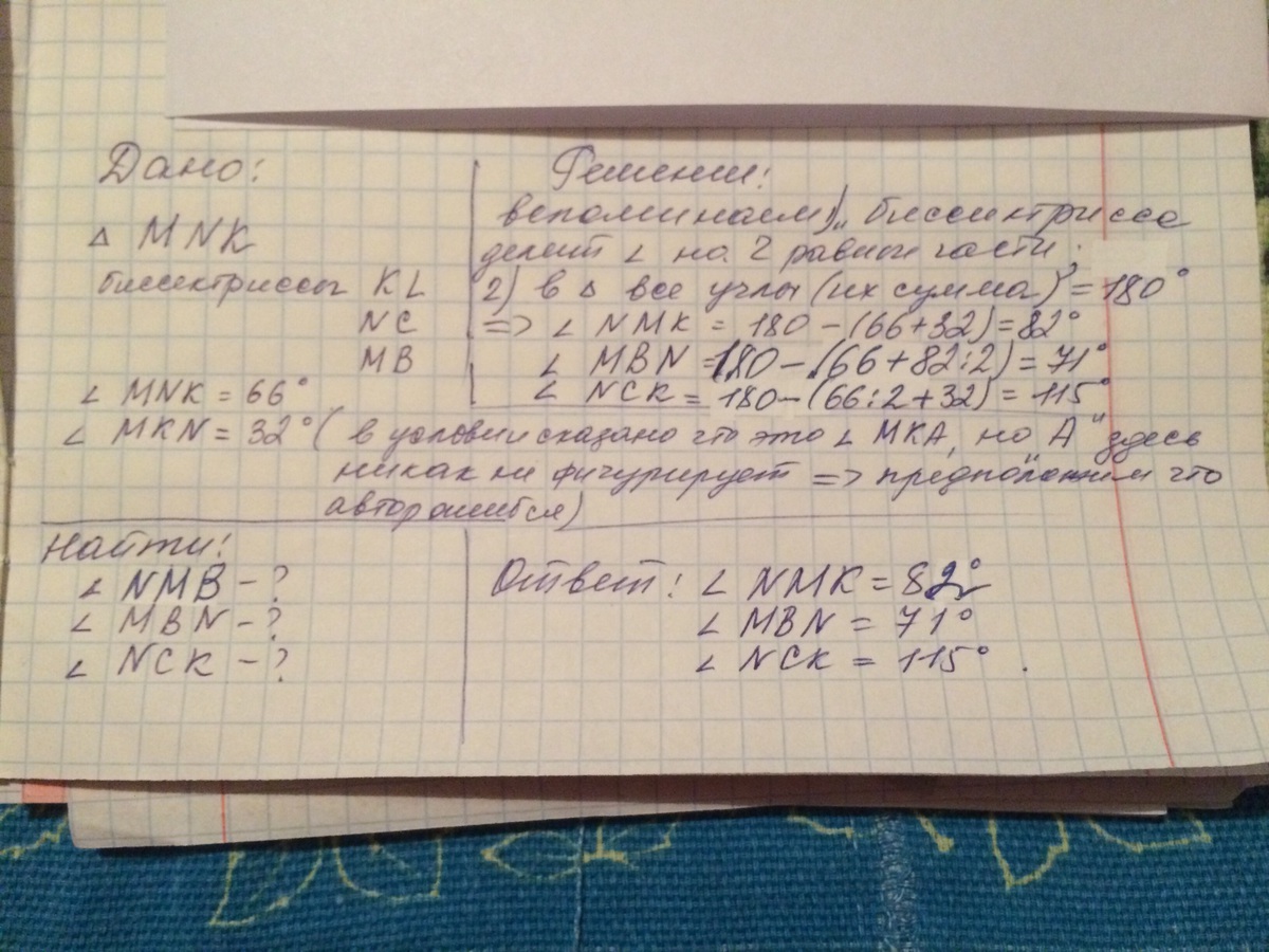 Отрезки KL NC MB биссектриы треугольника MNK.Найдите углы NMB,MBN,NCK при условии,что угол MNK равен 66 градусов.угол MKA равен 32 градуса.