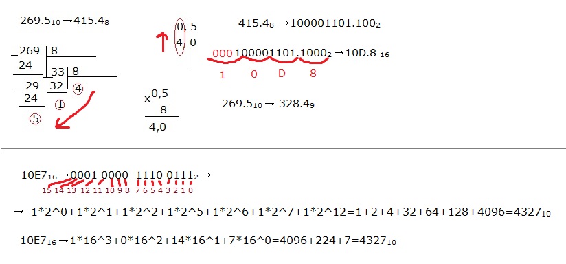 1)269,5(10)=415,4(8)=100001101.1000(2)=10D.8(16)