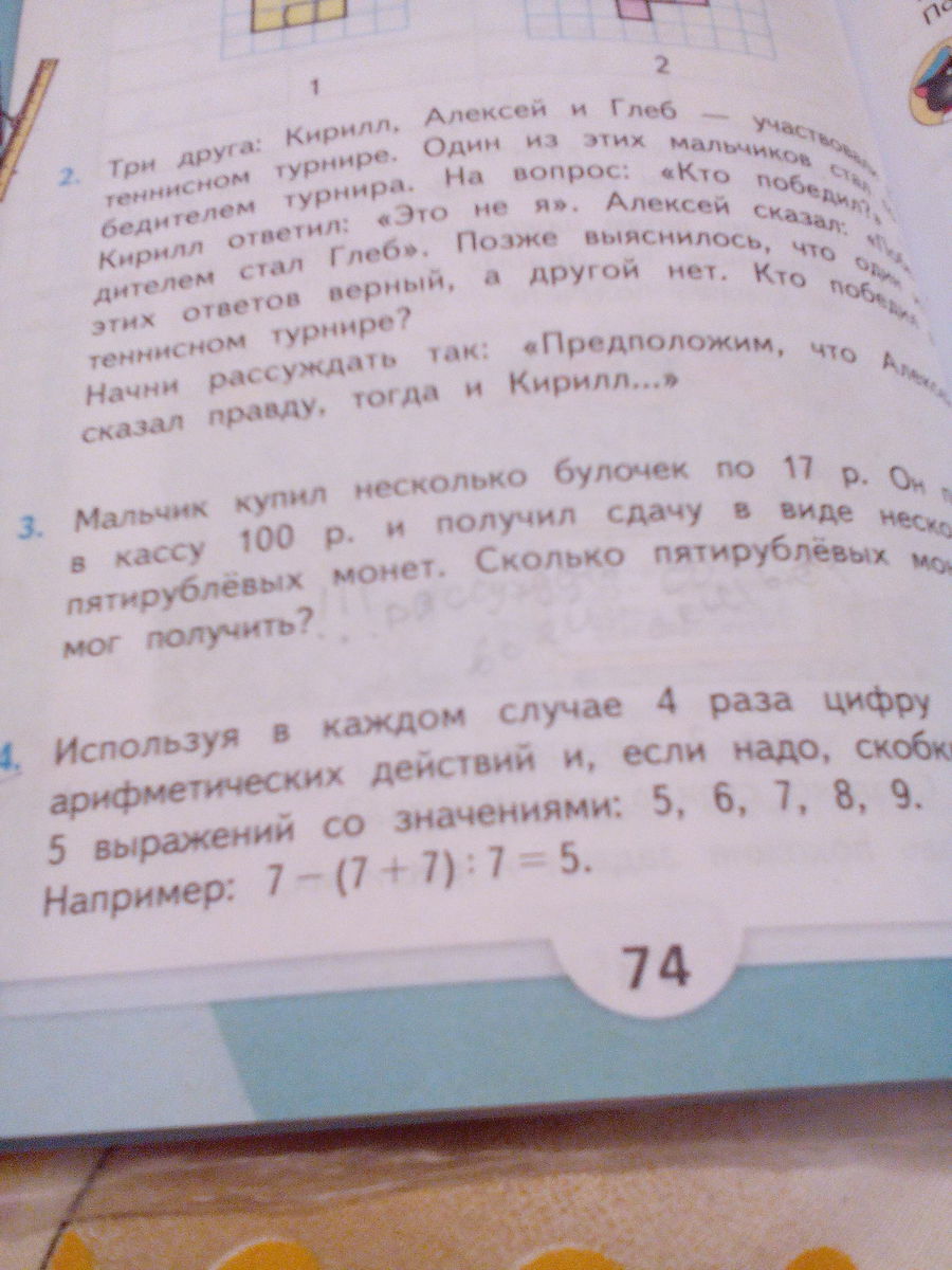 он купил несколько булочек по 17 руб и ему дали сдачу пятирублевыми монетами. значит мы должны взять столько булочек по 17 рублей, чтобы число сдачи было кратно 5. Это число 5 (булочек)