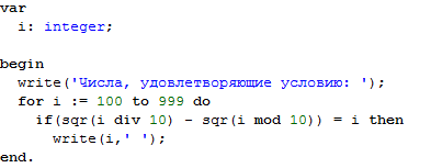 if sqr(10 * a + b) - sqr(c) = 100 * a + 10 * b + c then Writeln(a, b, c)