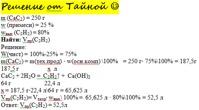 Обчисліть обєм ацетилену(н.у) який можна добути з 250г кальцій карбіду що містить 25% домішок якщо вихід ацетилену становить 80% від теоретично можливого