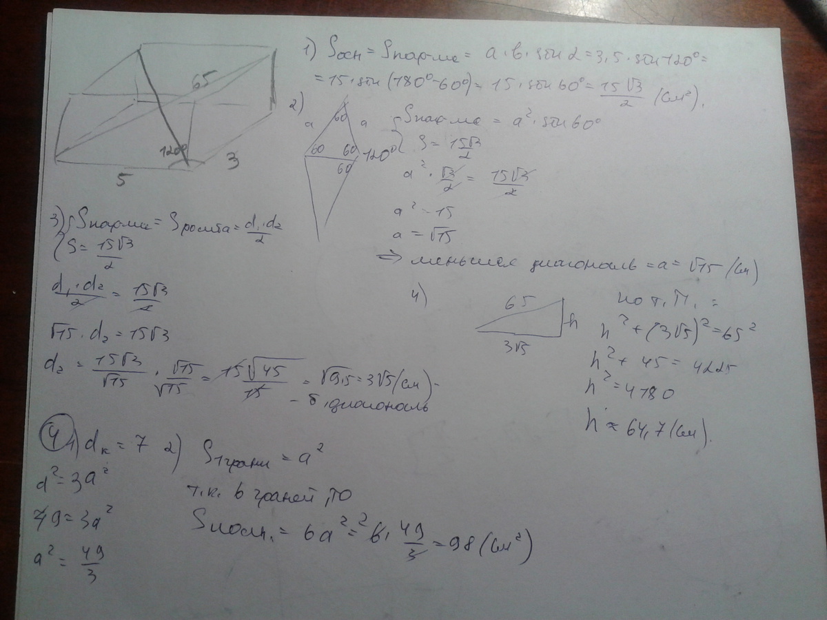3. Сторони осяови прямого паралелепіпеда дорівнюють З су і 5 см, а кут між ними — 120°. Знайдіть бічне ребро і меншу діагональ паралелепіпеда, якщо його більша діагональ дорівиюе 65 см