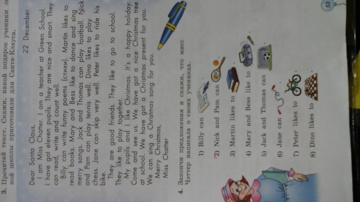 Билли умеет писать забавные стихи. Мартин любит читать книжки. Мэри и Бэсс любят танцевать и петь рождественские песни. Джек и Томас умеют играть в футбол. Ник и Пэм хорошо играют в теннис. Дино любит играть в шахматы. Jane can skip very well(не смог перевести). Питер любит кататься на его велосипеде.