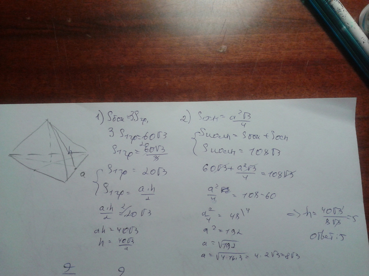 1. Знайдіть висоту правильної трикутної піраміди, площа бічної поверхні якої дорівнює 60 корень з 3 см, а площа повної поверхні 108 корень з 3 см