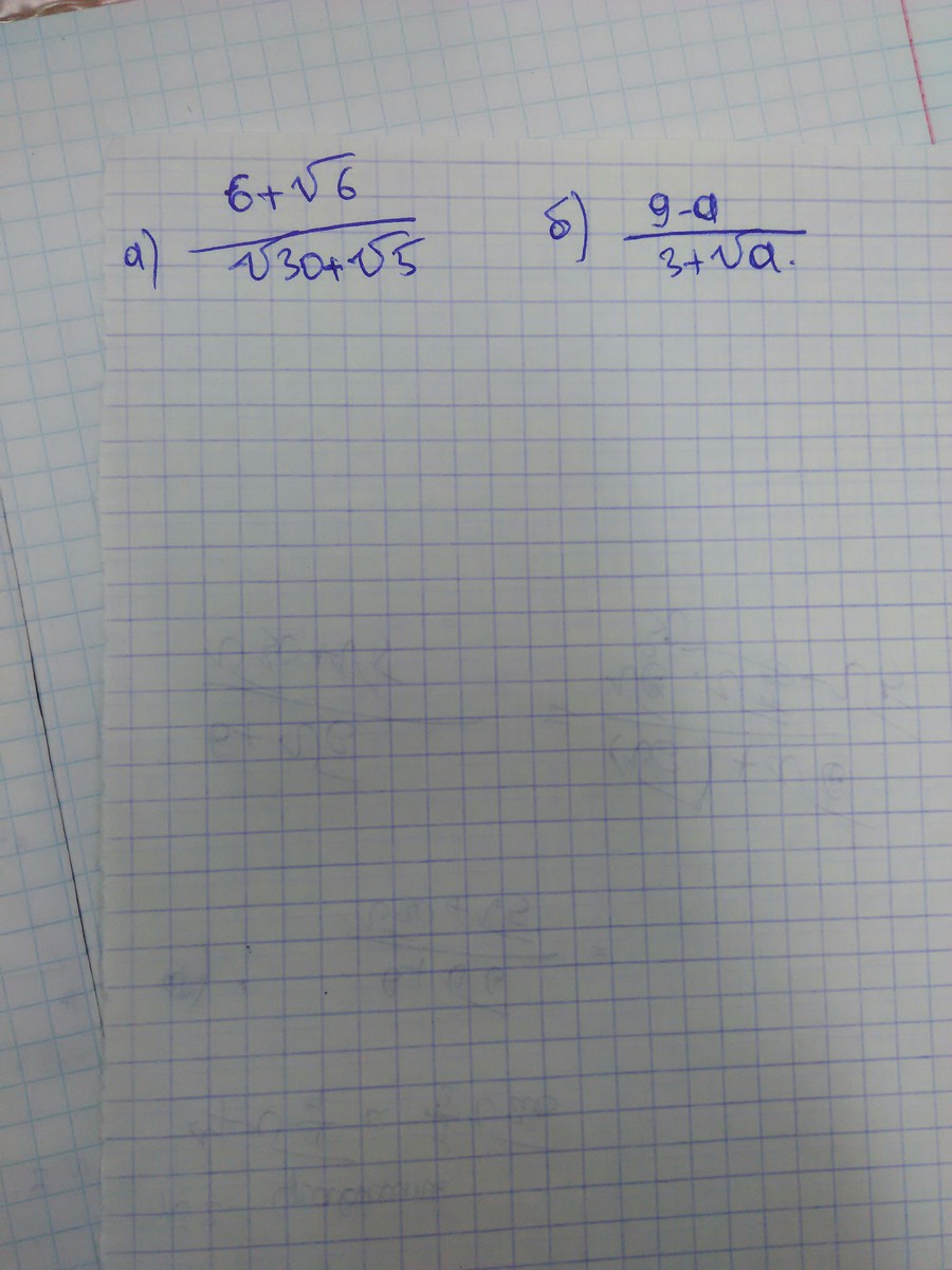 ...=frac{sqrt{6}(sqrt{6}+1)}{sqrt{5}(sqrt{6}+1)}=frac{sqrt{6}}{sqrt{5}}\\...=frac{(3-sqrt{a})(3+sqrt{a})}{3+sqrt{a}}=3-sqrt{a}