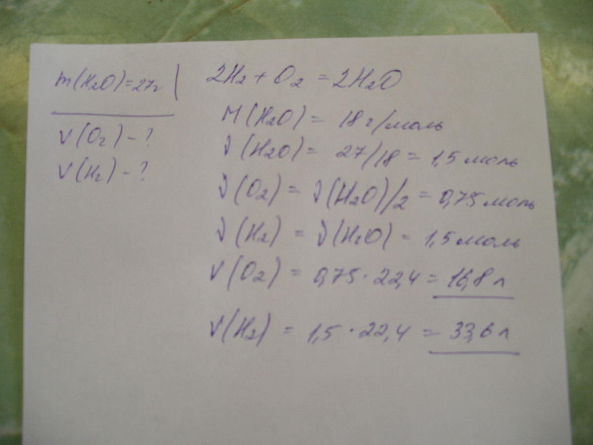 Помогите решить задачу пожалуйста. В результате реакции между водородом и кислородом образовалась вода массой 27г. Найдите объёмы (н.у.) вступивших в реакцию газов. (Решение подробное)